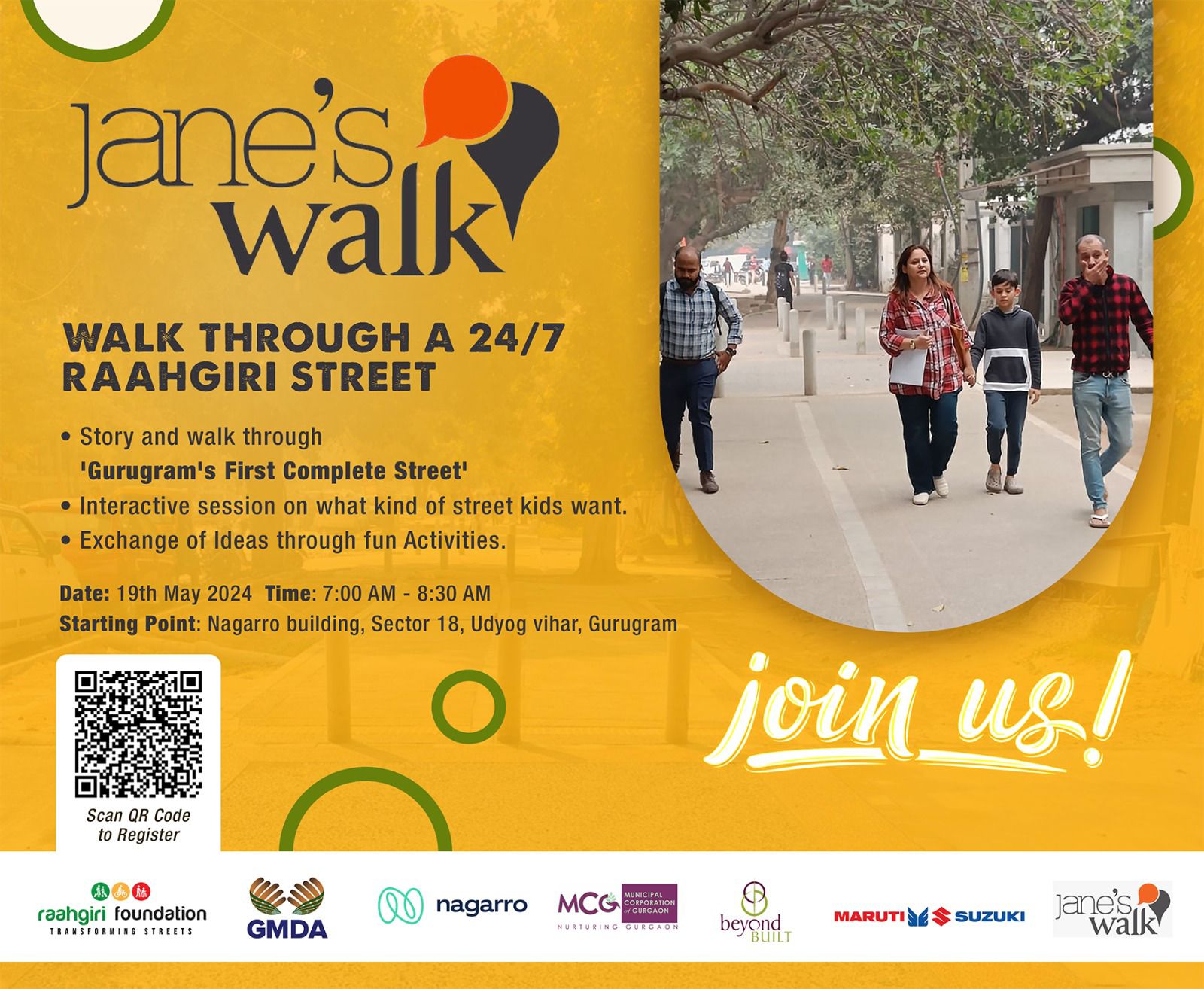 Do register, scan QR code in poster. We especially encourage RWAs, schools and involved citizens to participate! Sunday May 19: 7:00am – Meet at Nagarro office, Udyog vihar, Building No. 13, Sector 18 7:05am – Short talk on Sanath Road “Gurugram’s first complete street” 7:15am – Walk down Sanath Raah! 8:00am onwards – Refreshments and discussion Looking forward to take you through a most equitable, accessible and safe and sustainable street!