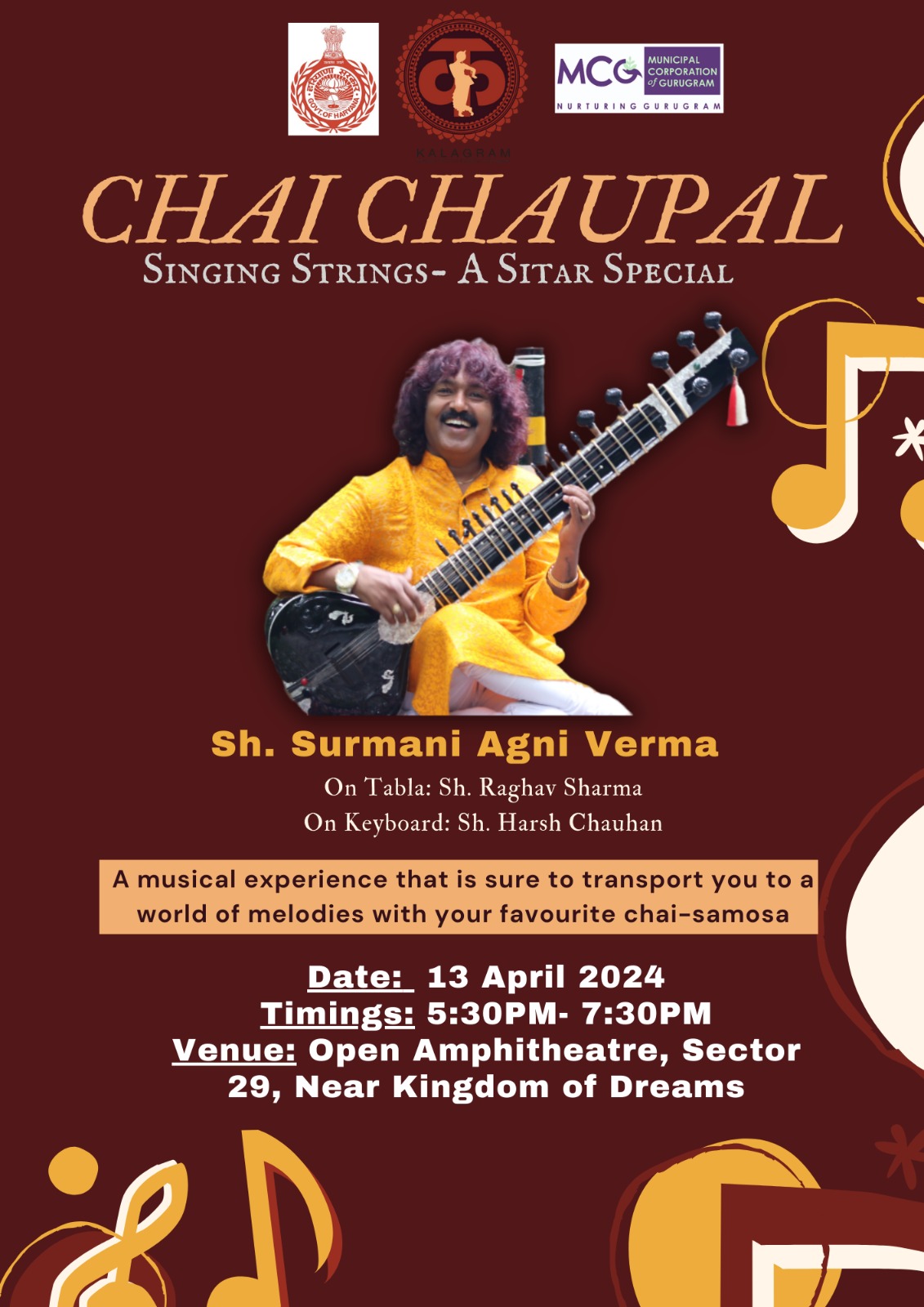 Upcoming 29 Mar 2024 – 07 Apr 2024 Join us for a sitar special Chai Chaupal organized by Kalagram! This month’s arrest, Sh Surmani Agni Verma is a highly acclaimed Sitar player who studied under renowned masters such as Pt. Raja Ram Jaiswal and Ust. Shahid Parvez Khan. He holds prestigious awards and is recognized as a “B High” grade artist by A.I.R. He set a record for 60 hours nonstop sitar playing and performed internationally in countries like New Zealand and Sri Lanka.